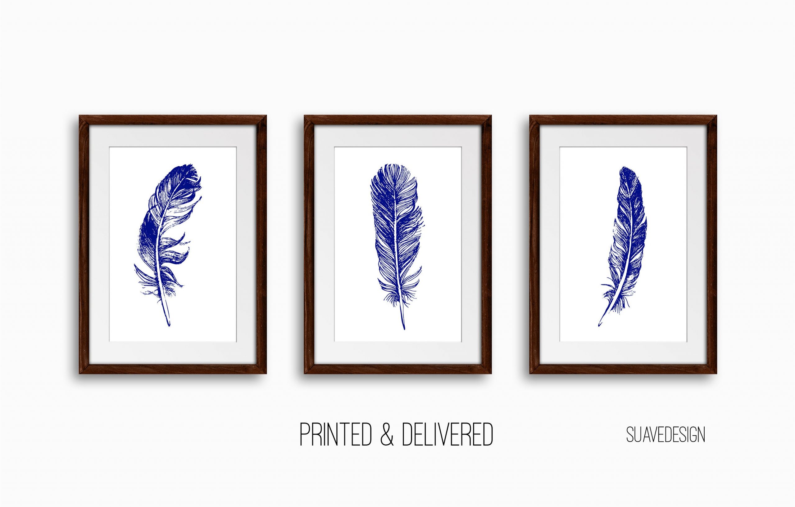 Grey Feathers Print Set, Royal Blue Feather Wall Art, Set of 3 Wall Decor Art Prints, Living Room, Sketched Wall Art